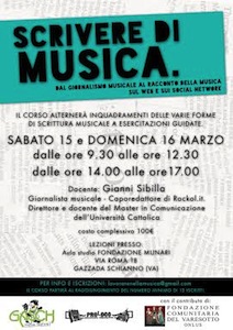 Proloco di Gazzada Schianno e GaSch Music Festival, presentano il terzo corso del progetto “Lavorare in campo musicale una sfida possibile”. Nel mese di marzo Gianni Sibilla (Giornalista musicale – Caporedattore di Rockol.it – direttore e docente del Master in Comunicazione dell’Università Cattolica) condurrà un workshop dal titolo "Scrivere di Musica" di due giornate nel quale verranno inquadrate le diverse forme del racconto musicale attraverso la parola scritta, analizzando, commentando ed esercitandosi sia sulle forme “classiche” che su quelle nuove. Giornalismo musicale, quindi, ma non solo: cosa significa scrivere di musica oggi? Dove si scrive e come si scrive? Come proporsi ad una testata, gestire un blog, o postare su Facebook o su Twitter? Le lezioni alterneranno momenti di spiegazione teorica a esercitazioni guidate sulle varie forme di scrittura musicale.