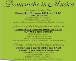 Il primo appuntamento è domenica 2 marzo alle ore 17 presso la Sala Duse di Besozzo: il pianista Marco Targa e la soprano Gloria Di Blasi ci introdurranno nella storia delle colonne sonore di film con proiezioni di immagini e sequenze cinematografiche durante le esecuzioni."L’evento di apertura, in cui l’esecuzione di celebri colonne sonore si accompagnerà alla visione di sequenze cinematografiche, farà da apripista a concerti in cui formazioni un po’ particolari (un trio composto da pianoforte, flauto e chitarra e un secondo trio che al pianoforte unisce oboe e corno) si cimenteranno in brani musicali diretti a creare suggestioni fantastiche e a suscitare immagini evocative. Mentre il primo incontro si svolgerà, grazie alla preziosa collaborazione del Comune di Besozzo, presso la sala Duse (che quindi tornerà un po’cinema per un pomeriggio), gli ultimi due concerti avverranno nella nuova sala della Fondazione Ronzoni che apre le proprie strutture per ospitare eventi culturali aperti alla cittadinanza. Un’unione di arte e solidarietà che rende più ricca Besozzo e merita di essere sostenuta.
