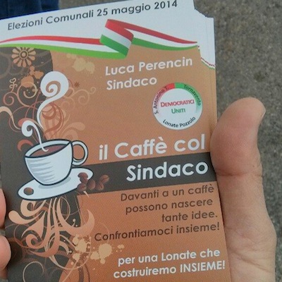 Parlare del futuro di Lonate davanti ad un bel caffè, nel momento migliore per ogni singolo cittadino. È il "caffè col Sindaco" proposto dai Democratici Uniti e da Luca Perencin per le prossime Elezioni Amministrative: una campagna elettorale one to one, per parlare dei singoli temi, approfondire e farsi conoscere. Telefonando al 347 2650667 o scrivendo a caffe@lp2014.it sarà possibile fissare un incontro, negli orari e nei luoghi più comodi, per poter parlare liberamente davanti ad un caffè, per discutere dei problemi di Lonate, ma anche per proporre iniziative e idee per migliorare insieme il paese» spiega Luca Perencin, candidato sindaco dei Democratici Uniti. «Un’iniziativa che vuole riportare il dialogo tra i cittadini e la politica al livello del singolo, con un contatto diretto, e che proseguirà anche dopo il voto del prossimo maggio, a dimostrazione della nostra volontà di apertura e trasparenza».