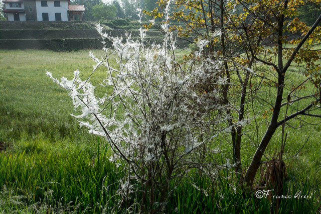 L’arbusto in fotografia è stato attaccato da larve del genere Iponomeuta (verosimilmente I. malinella, andrebbe verificato). Si tratta di lepidotteri defogliatori che in certe annate presentano “gradazioni” di sviluppo notevole. Quest’anno sta avvenendo in molte aree del novarese, milanese e varesotto, attaccando preferibilmente Euonymus europaeus (berretto del prete, come l’arbusto in fotografia), Corniolo ed anche piante da frutto. La larva non è urticante per l’uomo e gli animali e per quanto il fenomeno della defogliazione e delle ragnatele sericee sia impressionante, non procura seri danni alla vegetazione.
