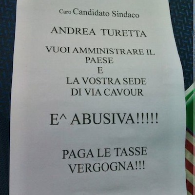 Un attacco portato a colpi di volantini distribuiti a Castronno scalda le ultime ore di campagna elettorale. Sul foglio c’è un attacco personale al candidato sindaco di Castronno Viva Andrea Turetta, accusato di non pagare le tasse per una non meglio identificata sede di via Cavour: «Non abbiamo sedi come Castronno Viva, nè ne ho io a titolo personale. Respingo al mittente le accuse, io sono un dipendente publico e le tasse le pago tutte. Sporgerò denuncia ai carabinieri per diffamazione, chi ha distribuito i volantini è stato riconsciuto e identificato. Evidentemente diamo fastidio a chi pensava di aver già vinto, o rivinto».