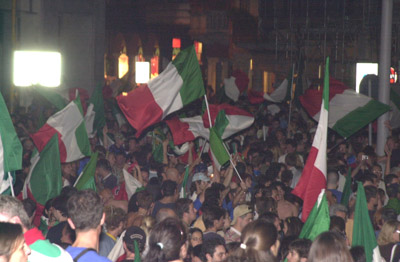 Il Mondiale di calcio è l’evento sportivo che più di tutti raduna davanti alla tv gli italiani. Molti, moltissimi, precedono la visione delle partite – quelle dell’Italia in particolare – grigliate e pizzate in compagnia in giardini, cortili, terrazzi privati. Tanti altri amano guardare la partita in gruppo e in particolare nelle piazze (vi ricordate il delirio collettivo dopo la vittoria di Berlino sulla Francia nel 2006? – nella foto VN) e così anche per Brasile 2014 associazioni, enti locali e comuni si sono adoperati per allestire i maxi schermi.