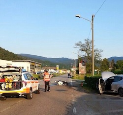 Scontro tra un’auto e una moto a Mesenzana, poco prima delle 19, sulla Statale 394: il 118 è intervenuto con automedica, ambulanze ed elisoccorso, sono coinvolti due uomini, trasferiti d’urgenza (uno a Luino e uno a Varese in codice rosso, uno a Legnano con elisoccorso, sempre in codice rosso) La strada statale è stata chiusa per oltre un’ora, anche per permettere la bonifica dei detriti e della benzina sull’asfalto ad opera dei vigili del fuoco, intervenuti sul posto. I rilievi sono affidati ai carabinieri di Maccagno.