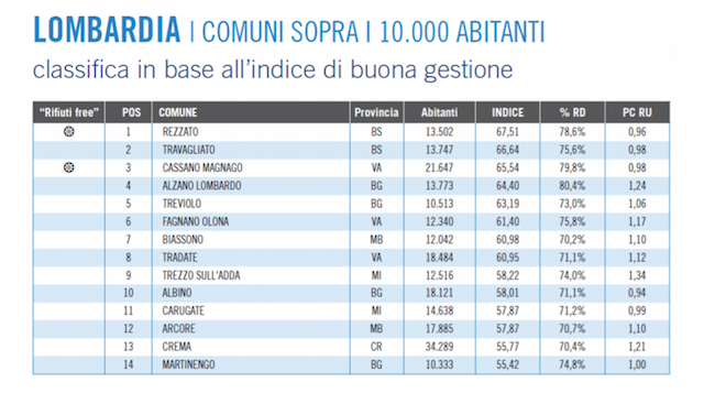 Nella graduatoria in base all’indice di buona gestione, storica classifica che conosciamo da anni, il Comune di Cassano Magnago si classifica al terzo posto in Regione Lombardia (regione ancora distante dai dettami normativi e dalla vicina regione Veneto) nei Comuni sopra i 10.000 abitanti con indice di gestione pari a 65,54 e con il 79,80 % di raccolta differenziata, con miglioramento rispetto all’anno passato. Primo Comune della Provincia di Varese.