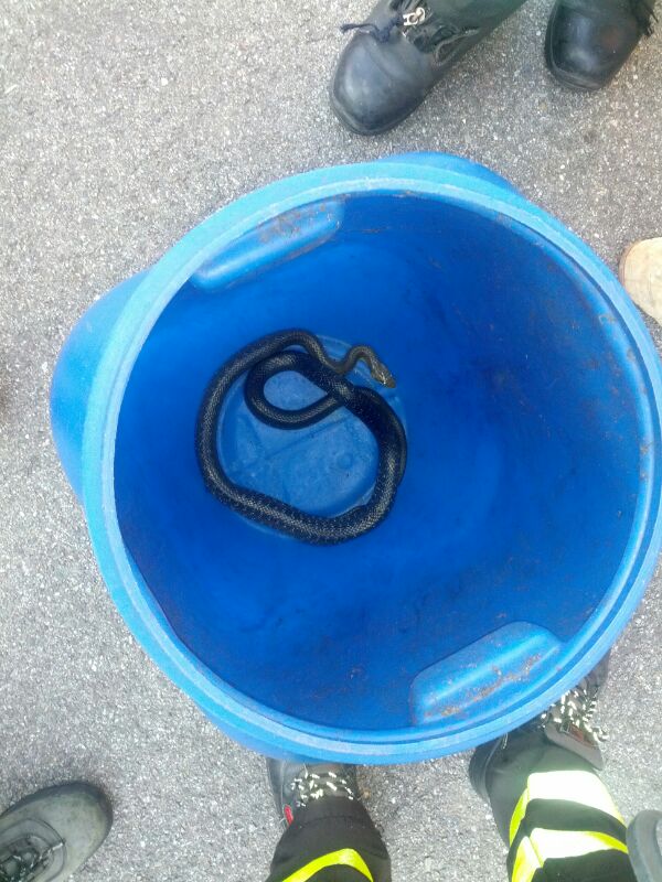 Si era sistemata sul tetto di una casa a Gazzada Schianno, probabilmente in cerca di sole e tranquillità, ma qualcuno deve essersi allarmato vedendo la sua sagoma scura. È così che la biscia (qui in foto) è finita nel secchio dei Vigili del Fuoco, compagnia di Varese, che dopo averla recuperata domani la liberaranno nei boschi.