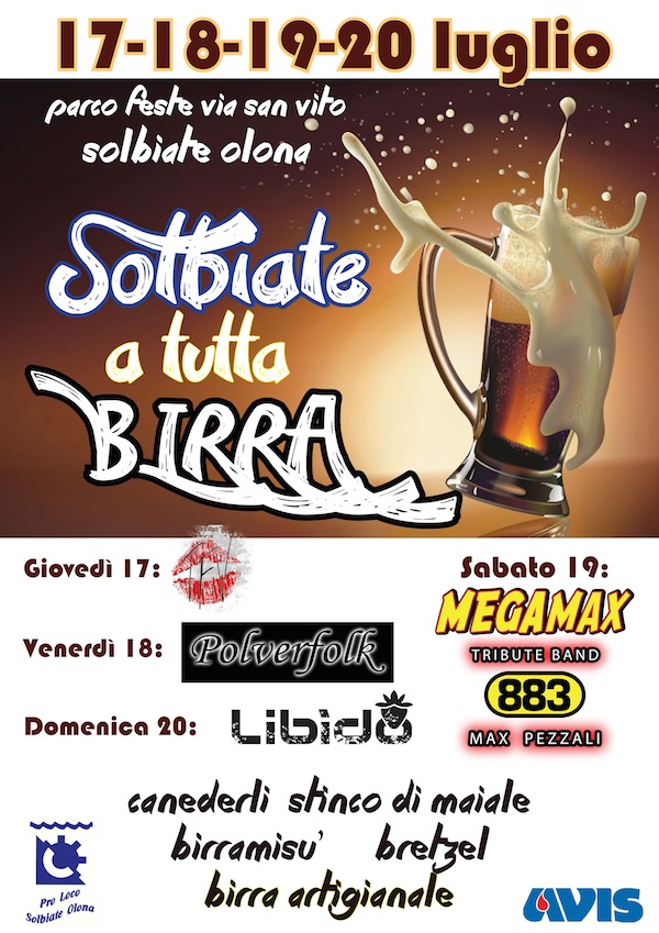 Per 4 giorni, da giovedì 17 luglio a domenica 20 luglio torna nel parco feste di Via San Vito a Solbiate Olona la festa "A tutta Birra". Un lungo weekend di festa, buon cibo e ottima musica nata dalla collaborazione tra Pro Loco e Avis. Ecco il programma della manifestazione: