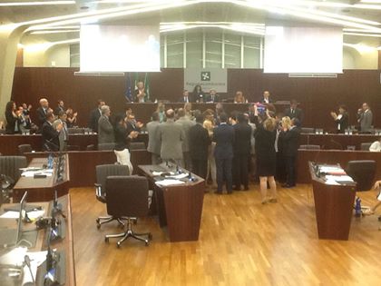 Un vero e proprio abbraccio da tutta la sua maggioranza (foto). Inizia così il discorso di Roberto Maroni nell’Aula del Consiglio regionale il giorno dopo la notizia dell’avviso di garanzia a suo carico. «Ho accolto l’invito a riferire in questa Assemblea per il rispetto delle istituzioni che ho – ha spiegato il presidente -, ma per lo stesso rispetto che nutro per il lavoro della magistratura devo asternermi da commenti o giudizi prima di aver letto il fasciolo ed essere ascoltato la magistrato».