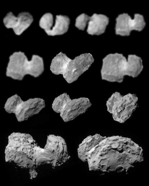 Un’ultima, decisiva correzione di rotta denominata CAT-I (Close Approach Trajectory – Insertion) è programmata oggi 6 Agosto: lo scopo è di ridurre la velocità sonda-cometa a meno di 1m/s (la velocità di una persona che cammina). In questa situazione ROSETTA e cometa saranno praticamente ‘ferme’ reciprocamente a circa 100 km di distanza (ma in realtà la loro velocità assoluta è di ben 55.000 km/h !), una condizione fondamentale per permettere a ROSETTA mettersi in orbita attorno alla cometa per almeno 17 mesi. Una operazione, quella di entrata in orbita, mai tentata prima e difficilissima, data la forma assolutamente incredibile della cometa (vedi foto-montaggio alleato). Tutte queste manovre da ‘fantascienza’ si svolgono ad altre mezzo miliardo di km dalla Terra, dopo che ROSETTA, in 10 anni di viaggio, ha percorso qualcosa come 6,5 miliardi di km. Da tutto il mondo è possibile seguire in diretta la fase finale dell’avventura di ROSETTA sul sito dell’ ESA