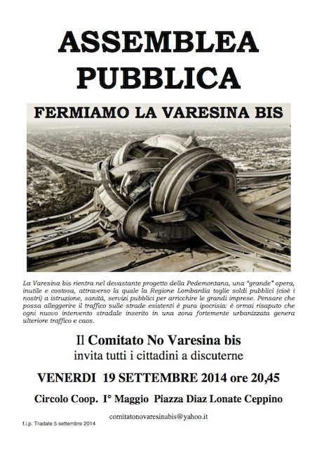 "Fermiamo la Varesina Bis", nuova assemblea pubblica per il Comitato che sta cercando di far rivedere o annullare il progetto di realizzazione della nuova arteria stradale connessa a Pedemontana. L’appuntamento è in programma per il 19 settembre a Lonate Ceppino, alle 20,45 al Circolo Coop. I° Maggio in Piazza Diaz.