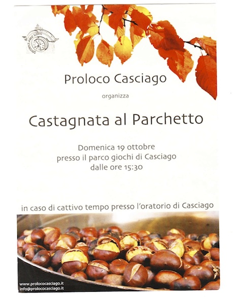 Una domenica al parco giochi, col profumo di sapore di castagne nell’aria e nei cartocci. L’appuntamento è organizzato dalla Pro Loco di Casciago domenica 19 ottobre, a partire dalle 15.30, nel parchetto di via Pascoli. In caso di maltempo, l’evento sarà spostato nel salone dell’oratorio di Casciago. Per maggiori informazioni www.prolococasciago.it o info@prolococasciago.it.