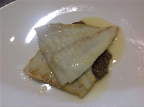 Filetto di rombo chiodato al tegame, lenticchie di Castelluccio e emulsione al vino bianco