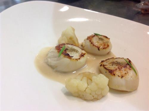 Capesante alla plancia con crema di cavolfiore, brodo di soia e polvere di capperi disidratati