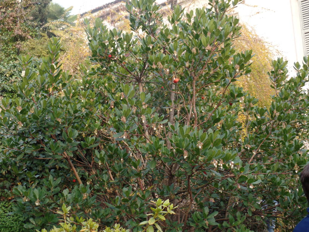 Purtroppo non sono riuscito a fotografare la facciata principale della villa in stile neo classico come in molte ville realizzate dallo stesso professionista. Prima di entrare nel cortile della villa, che ha mantenuto l’originaria struttura degli edifici dell’epoca e precisamente una struttura quadrangolare simile ad un fortilizio di facile difesa sia da attacchi esterni sia per il controllo dei conviventi, mentre l’attenzione dei visitatori era attratta da una risorgiva e della quale erano state riconosciute le capacità taumaturgiche note o inventate per tutte le sorgenti noto un cespuglio di corbezzolo (2)(Arbutus unedo) ancora molto giovane ma con la caratteristica presenza in contemporanea dei fiori bianchi e dei frutti rossi che assieme alla foglia verde rappresentavano il tricolore.
