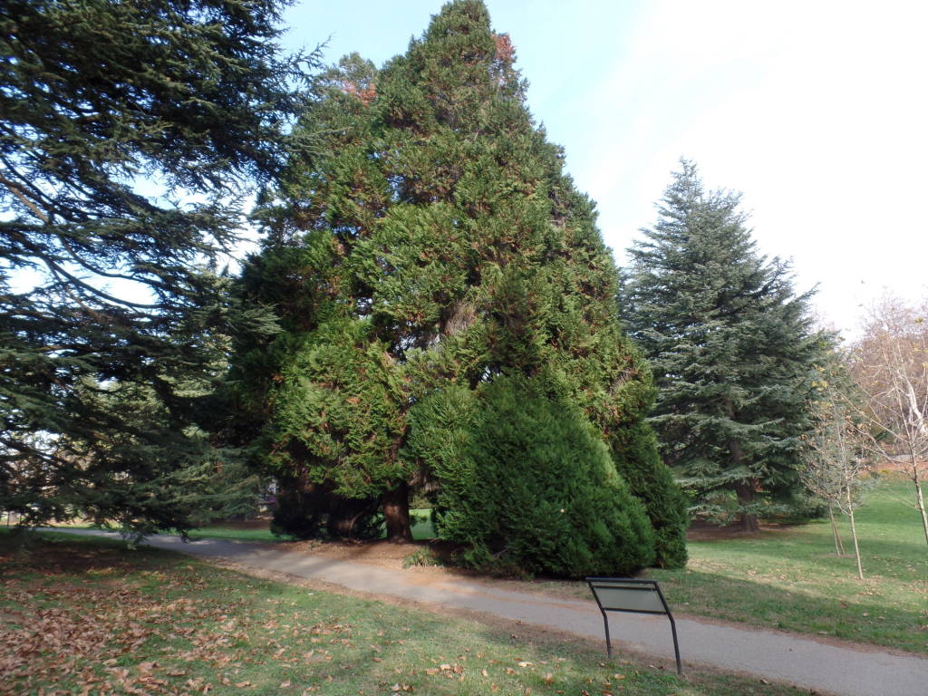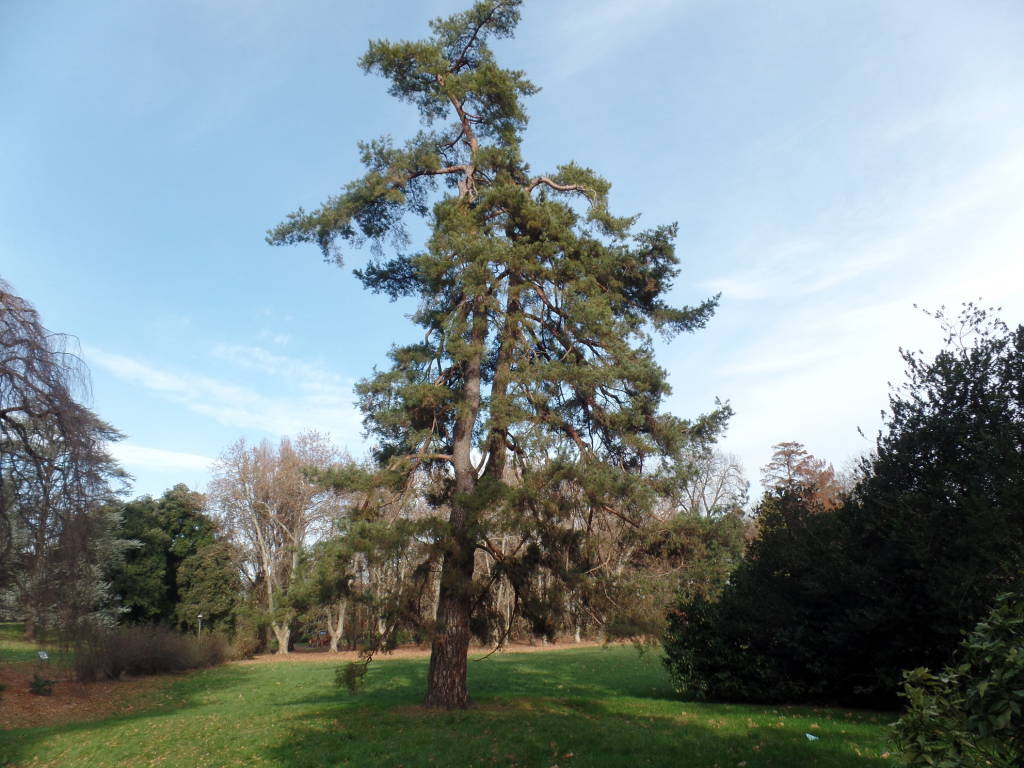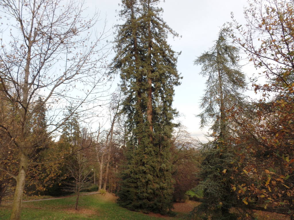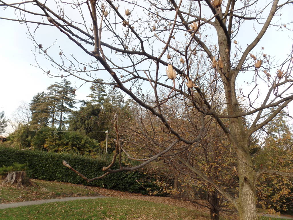 La domenica 15, la mattinata piuttosto nebbiosa nelle prime ore diventa più chiara verso le 11 quando abbiamo già deciso di fare un rapido giro in villa Mylius, dove preso atto che le condizioni climatiche hanno favorito una seconda fioritura del pesco giapponese che decidiamo di trascurare perché metterebbe in pessima luce la fioritura di fine inverno così ricca di fiori su rami privi di foglie costituisce una vera attrattiva e fotografiamo un Abete rosso (8) (Picea abies) una fra le piante sempreverdi utilizzate nei parchi, da un Cedro dell’Atlante (9) (Cedrus atlantica)che dalla seconda metà dell’800 è stato messo in quasi tutti i giardini, il Cipresso della California (10) (Chamaecyparis lawsoniana) più raro ma che offre uno spettacolo notevole per la struttura conica e con ramificazioni sin dalla base, da un complesso di Thuje (11) (Thuja occidentalis piante note per la quantità di resina che producono intensamente profumata da essere utilizzata come incenso nelle attività di culto, anche un Pino silvestre (12) si fa notare per la colorazione rossiccia del suo tronco, fra le cose particolari notate è un giovane albero dei Tulipani (13)( Liriodendrum tulipifera) ricchissimo dei calici residui di una abbondantissima fioritura d’inizio estate e nelle vicinanze le due Sequoie (14) (Metasequoia glyptostroboides) pianta ritrovata solo dopo la II guerra mondiale e quindi di impianto abbastanza recente ma il cui sviluppo è già notevole.