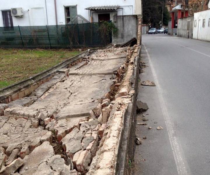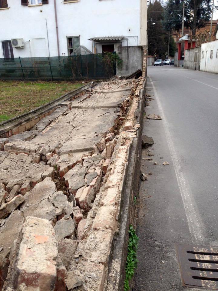 Colpa forse delle piogge dei giorni scorsi, colpa più in generale della vetustà del muro: un po’ malandato, si direbbe guardando le foto di Google Street, in parte già demolito in un tratto. Il muro delimita (o delimitava) un terreno “residuale”, rimasto stretto tra una vecchia casa, una villetta e una palazzina più recente: una situazione come tante altre, specie nei paesi.