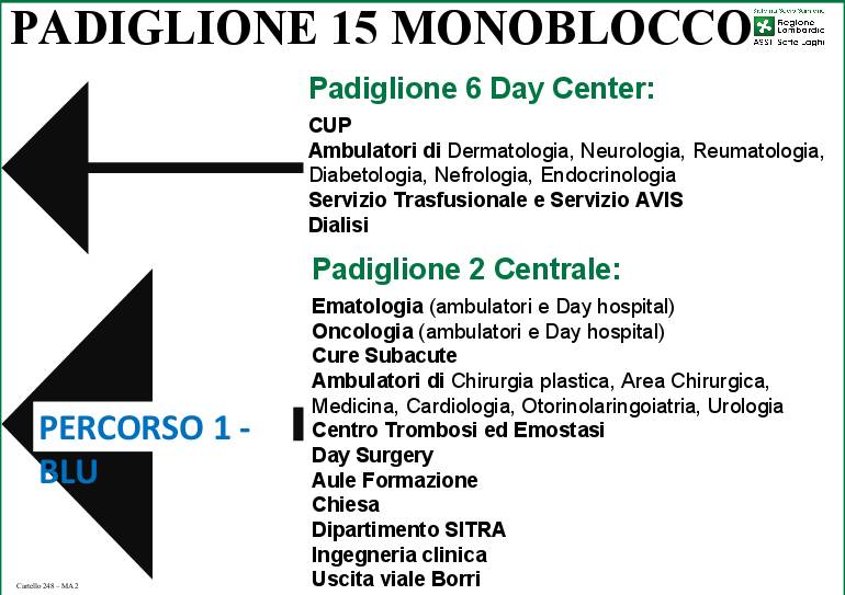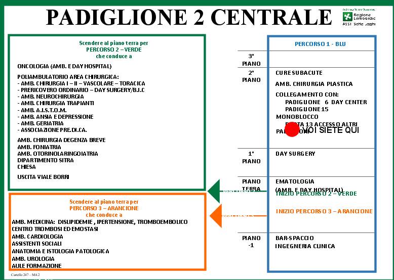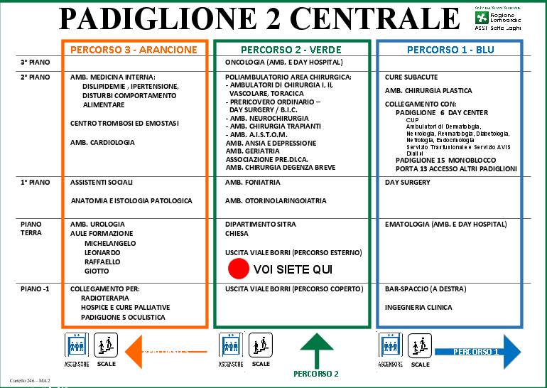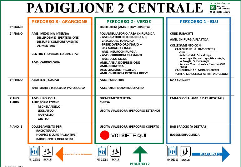 Per chi entra da via Lazio oppure raggiunge l’area con il pullman scendendo in viale Borri, l’azienda ha predisposto percorsi colorati come lungo i sentieri di montagna con delle lavagne esplicative: il percorso arancione per raggiungere gli ambulatori cardiologici, il percorso blu per il CUP e il monoblocco e il percorso verde per arrivare al settore oncologico e al Day hospital.