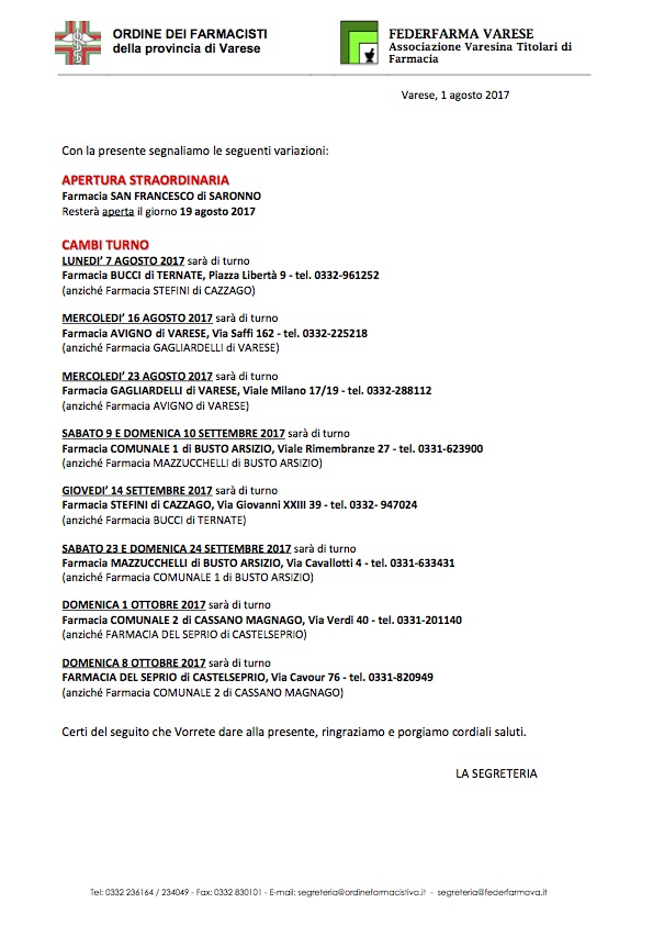 L’ordine dei farmacisti della provincia di Varese ha pubblicato alcune variazioni relative alle farmacie di turno della Provincia di Varese. Ecco nel dettaglio il documento: