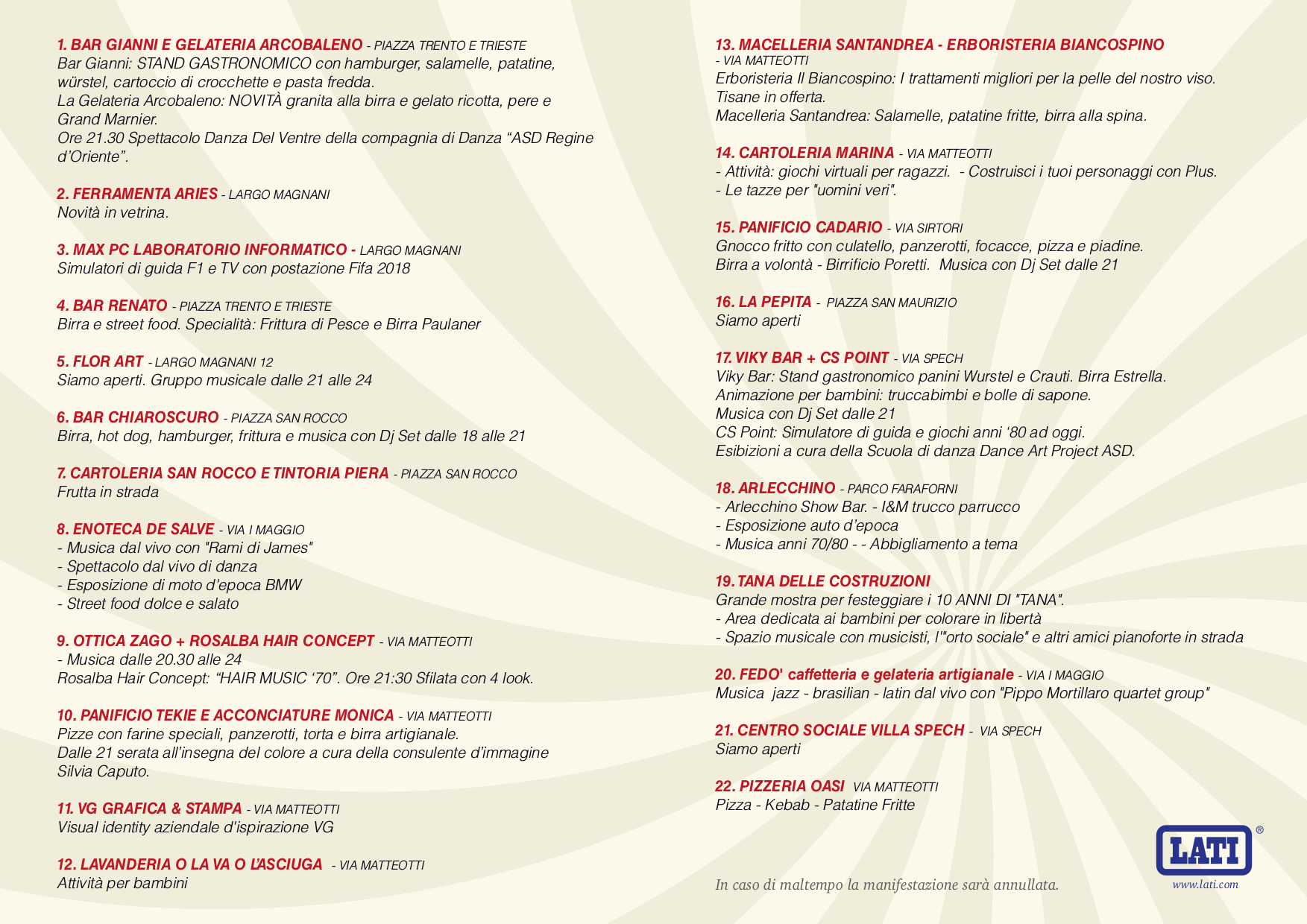 La festa, organizzata dal Comune in collaborazione con esercenti e commercianti, proporrà tantissimi eventi in tutto il paese con concerti, danza, animazione per bambini e street food, ma anche una mostra d’arte alla Tana delle costruzioni, simulatori di guida, esposizioni di auto e moto d’epoca.