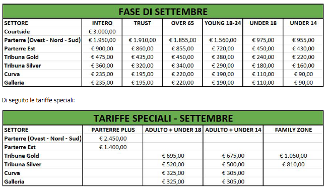 Da oggi invece la tariffa è piena e la disponibilità dei posti è libera: i diritti di prelazione per i vecchi abbonati infatti erano attivi solo nelle prime due fasi della campagna. Per aderire, i tifosi hanno a disposizione sei giorni: da giovedì 5 a sabato 7 e da giovedì 12 a sabato 14 settembre. Giovedì e venerdì l’orario di apertura è tra le 16 e le 20 mentre sabato sarà nelle due fasce 10-13 e 14-19.