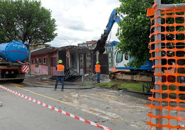 L’hanno visto in tanti, il lavoro di prima mattina del cantiere delle stazioni a Varese. Tante auto in transito in via Milano hanno potuto notare le ruspe al lavoro per l’abbattimento dell’ex biglietteria dei bus, nello spartitraffico che divide piazzale Trieste da viale Milano.