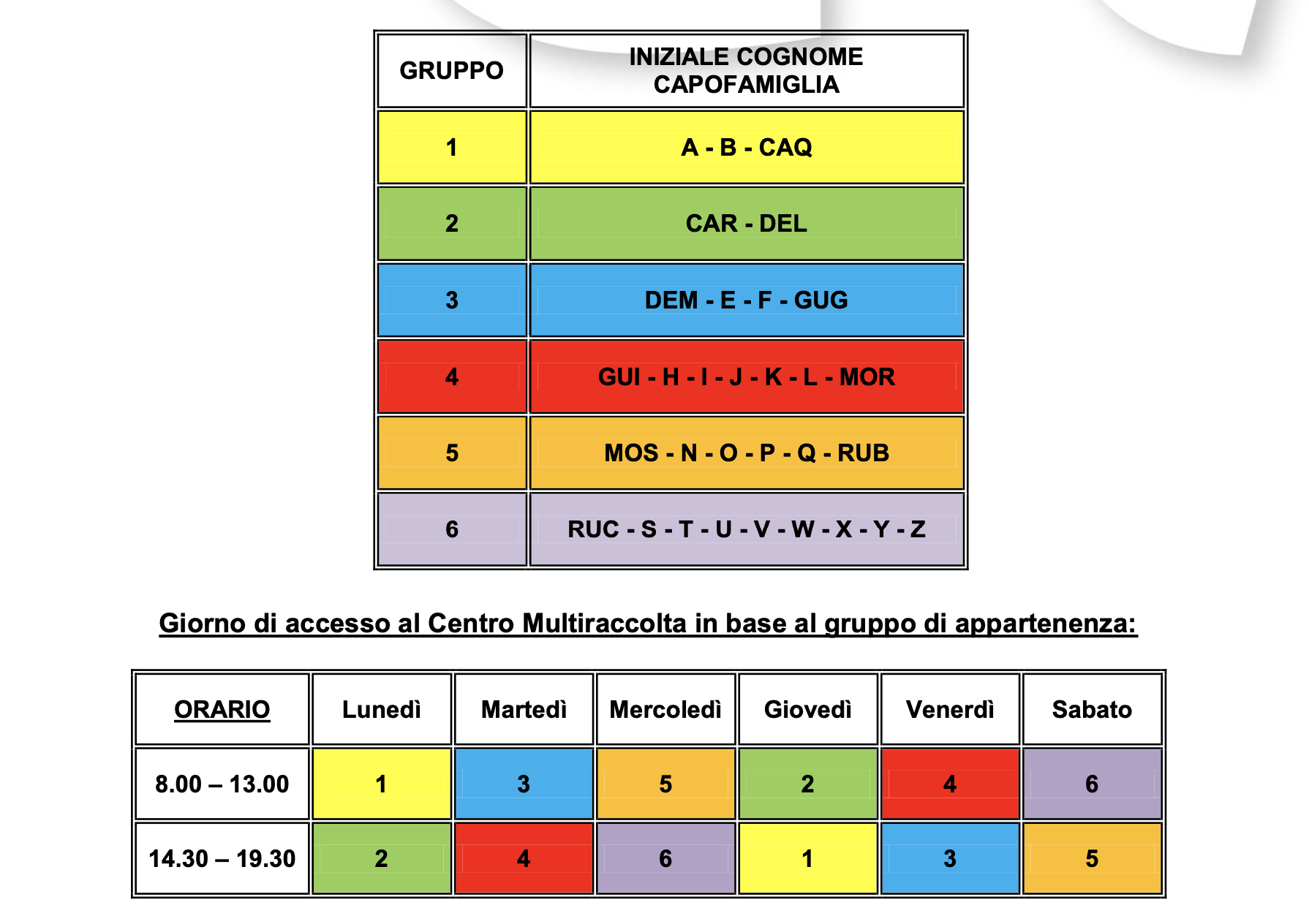 Le utenze private (nuclei famigliari) sono state suddivise in n. 6 gruppi omogenei a livello numerico, in base all’iniziale del cognome dell’intestatario della TARI, ai quali è stato assegnato uno specifico giorno di ingresso al Centro:
