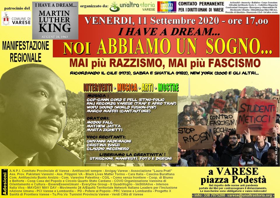 Tutto pronto per la manifestazione antirazzista e antifascista in programma venerdì 11 settembre a Varese in piazza Podestà (piazza del Garibaldino) a partire dalle 17, con molti ospiti, musica, mostre e letture.