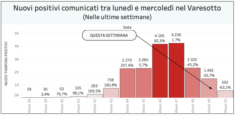 Vista l’oscillazione del numero di tamponi comunicati quotidianamente, che non è mai uniforme nei giorni della settimana, abbiamo costruito una visualizzazione che permette di confrontare i dati comunicati giorno per giorno con quelli degli stessi giorni della settimana precedente. In provincia di Varese quelli comunicati tra lunedì e mercoledì della settimana scorsa erano 1492 questa settimana sono 550. È il 63% in meno.