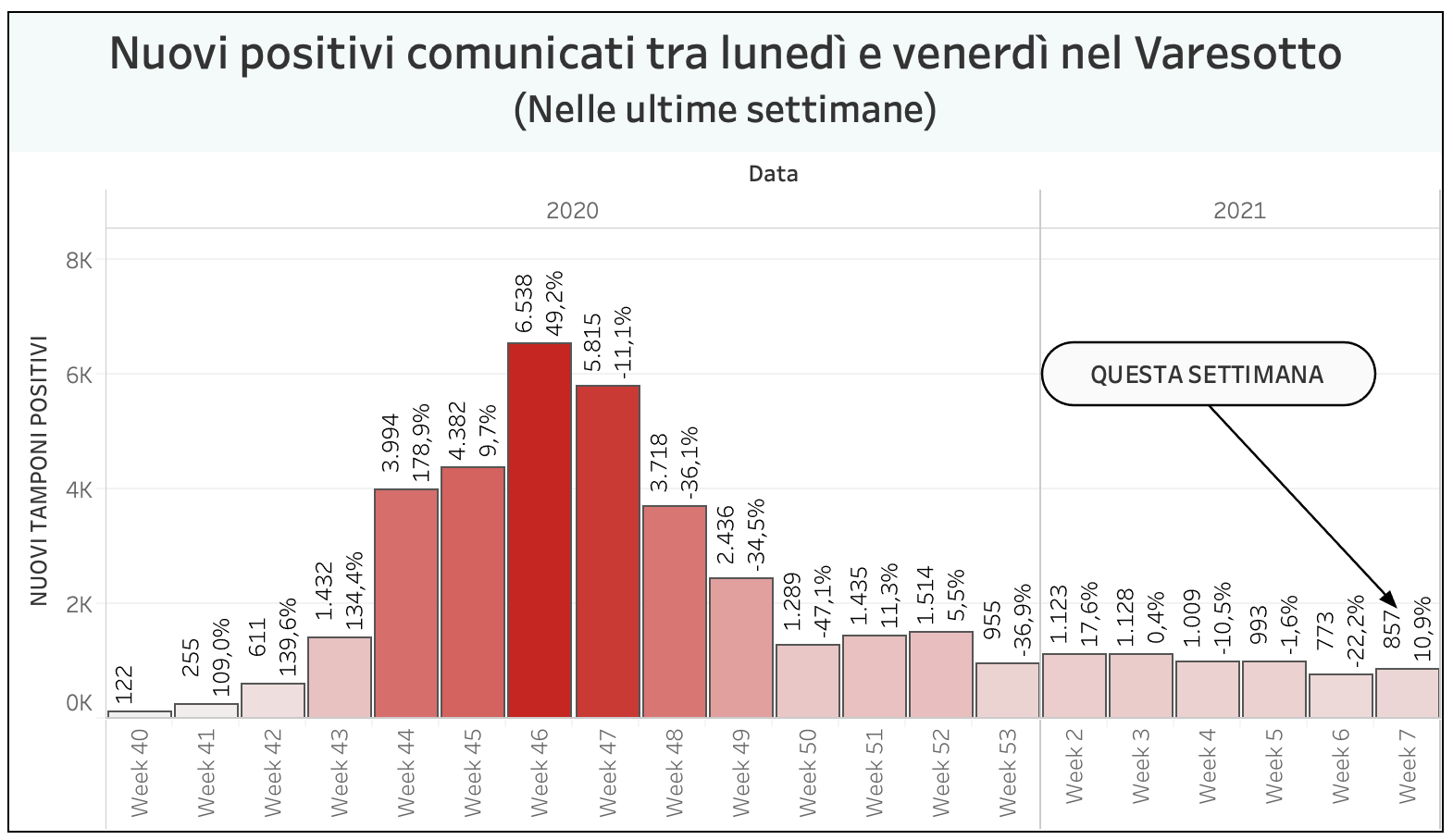 Vista l’oscillazione del numero di tamponi comunicati quotidianamente, che non è mai uniforme nei giorni della settimana, abbiamo costruito una visualizzazione che permette di confrontare i dati comunicati giorno per giorno con quelli degli stessi giorni della settimana precedente. In provincia di Varese quelli comunicati tra lunedì e venerdì della settimana scorsa erano 773 questa settimana sono 857. È il 10% in più.