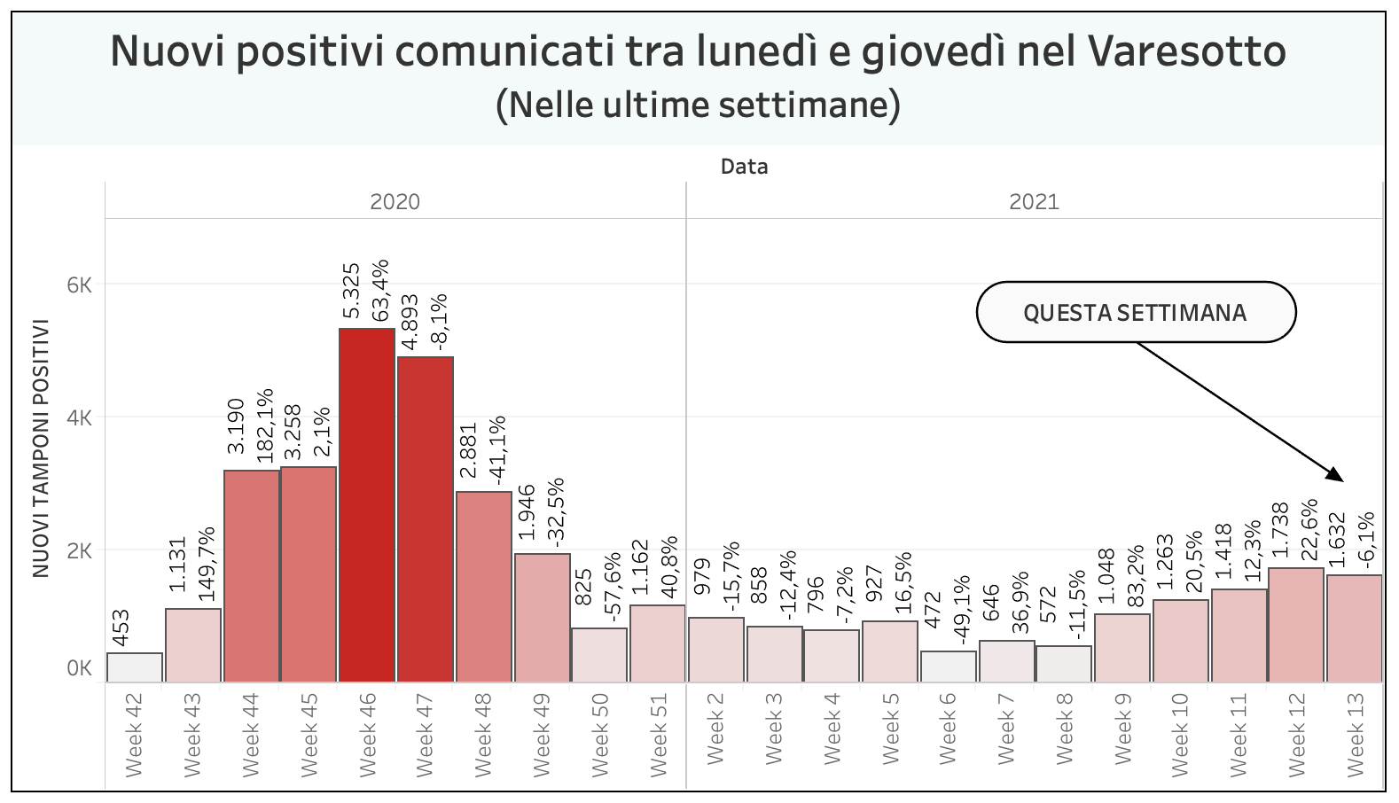 Vista l’oscillazione del numero di tamponi comunicati quotidianamente, che non è mai uniforme nei giorni della settimana, abbiamo costruito una visualizzazione che permette di confrontare i dati comunicati giorno per giorno con quelli degli stessi giorni della settimana precedente. In provincia di Varese quelli comunicati tra lunedì e giovedì della settimana scorsa erano 1738 questa settimana sono 1632. È il 6% in meno.