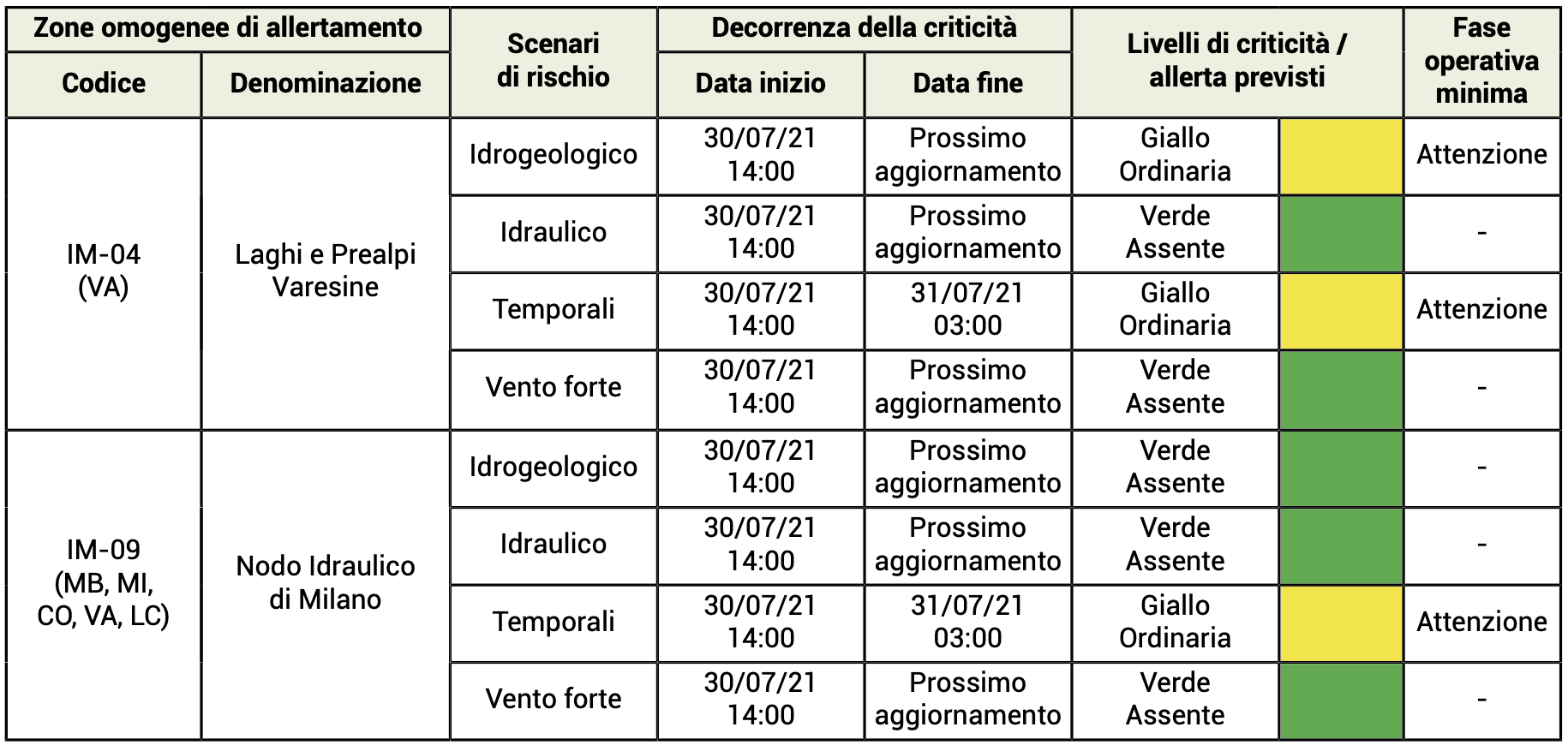 Il documento di allerta regionale prevede che per il pomeriggio di oggi, venerdì 30 luglio, “la Lombardia è interessata da un flusso di correnti in quota da Ovest-Sudovest con aria caldo- umida negli strati atmosferici più prossimi al suolo; all’interno di questo flusso potranno determinarsi a tratti condizioni favorevoli all’innesco di temporali già dal primo pomeriggio, ma con probabilità aumentata in serata e fino alle prime ore dopo la mezzanotte. L’esatta localizzazione dei fenomeni temporaleschi è estremamente incerta, ma laddove dovessero verificarsi, risulteranno anche di forte intensità, con accumuli di pioggia localmente molto elevati (maggiore probabilità sulla fascia prealpina e di Alta Pianura ed in particolare sulla fascia prealpina centro-occidentale) e forti raffiche di vento”.