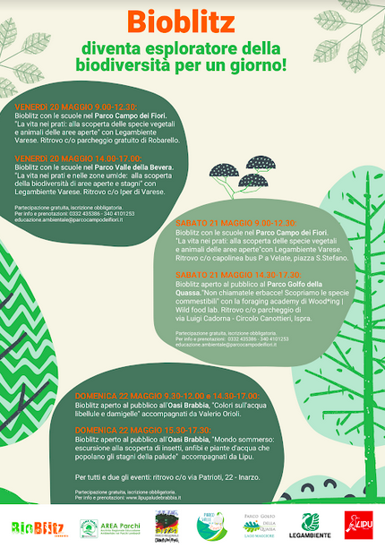 Il Parco Campo dei Fiori, Legambiente Varese e la Palude Brabbia Oasi Lipu aderiscono al Bioblitz, che quest’anno è arrivato alla sua 7° edizione. Dal 20 maggio al 22 maggio ci dedicheremo al monitoraggio della biodiversità non solo nel nostro Parco ma anche nel Parco Valle della Bevera, nel Parco Golfo della Quassa e nella Palude Brabbia.