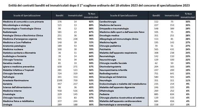 Il numero di contratti rimasti liberi è complessivamente 6.125 (di cui 5.095 contratti statali) su 16.165 contratti banditi (ben il 38%) e 1.648 contratti, precedentemente assegnati, non sono stati seguiti da immatricolazione, “confermando che la scelta di aumentare indiscriminatamente tutte le tipologie di contratti utilizzando un algoritmo inefficiente, senza una idonea programmazione e soprattutto senza una riforma della formazione medica non poteva che portare a queste conseguenze” commentano ALS e Anaao Giovani.