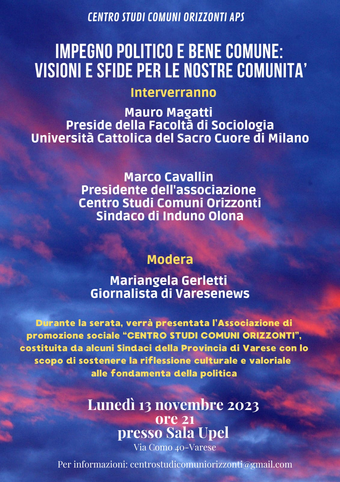 Lunedì 13 novembre alle 21 a Varese, incontro pubblico sul tema "Impegno politico e bene comune: visioni e sfide per le nostre comunità" con il professor Mauro Magatti, docente della facoltà di Sociologia dell'Università Cattolica di Milano