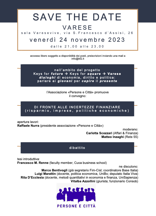 L’associazione “Persone e Città” promuove per venerdì 24 novembre prossimo, dalle 21,00 un dibattito sull’attualità economico-finanziaria, con digressioni giuridiche e di politica economica.