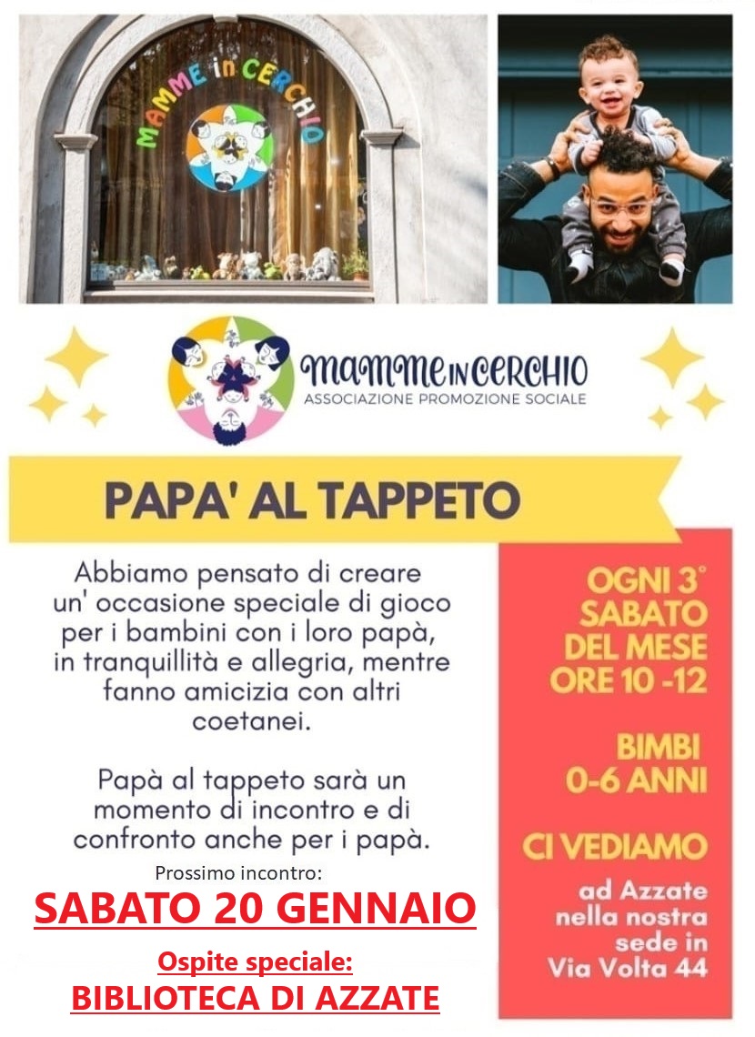 Papà al tappeto è uno spazio di incontro, di gioco e confronto riservato al lato maschile della genitorialità. Un’iniziativa ad accesso libero e gratuito, un appuntamento fisso, ogni terzo sabato del mese, dalle ore 10 alle 12 nella sede di via Volta 44 delle Mamme in Cerchio.