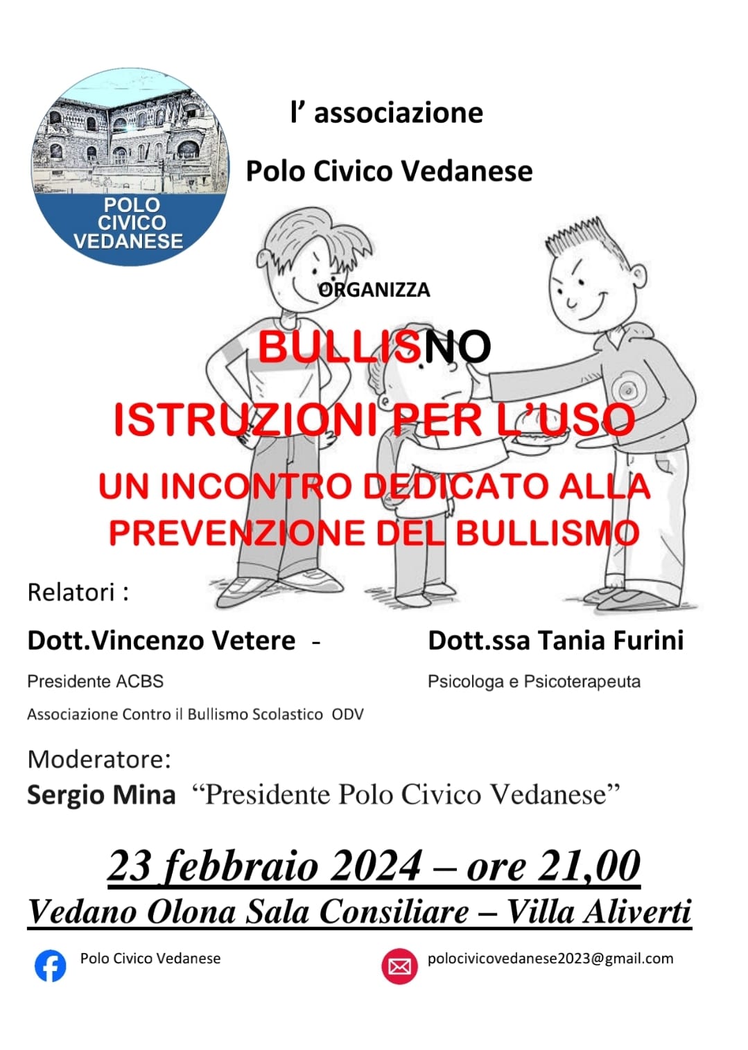Relatori dell’incontro, dedicato a genitori, insegnanti ed educatori e a tutti coloro che vogliono saperne di più su questo problema, il dottor Vincenzo Vetere, presidente di Acbs, associazione contro il bullismo scolastico, e la dottoressa Tania Furini, psicologa e psicoterapeuta. Modera l’incontro Sergio Mina, presidente del Polo civico vedanese.