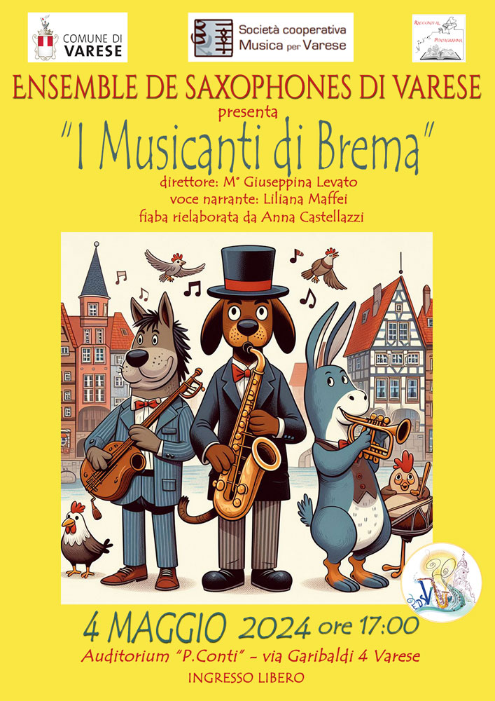 L’ensamble de Saxophones di Varese darà fiato, ritmo e melodia alla favola de I musicanti di Brema nel pomeriggio di sabato 4 maggio alle ore 17 all’Auditorium del Liceo Musicale Malipiero di Varese.