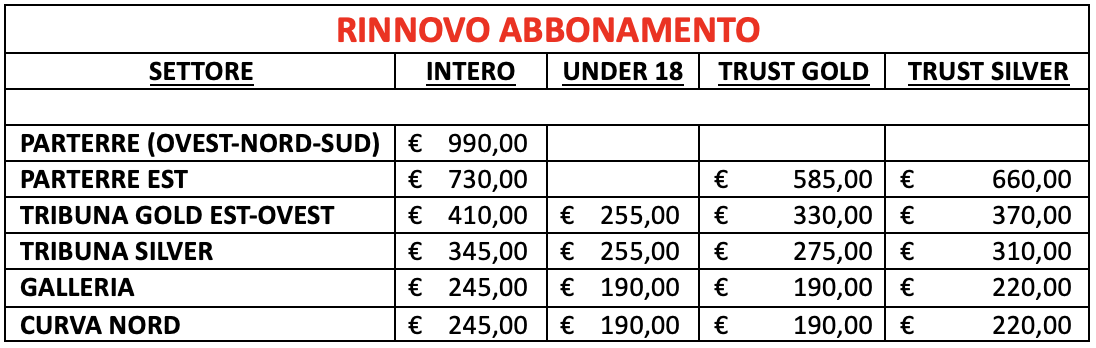 Nel corso della Prima Fase della campagna abbonamenti, sarà attiva una promozione dedicata ai posti in Parterre, che saranno acquistabili da tutti i tifosi (anche dai nuovi abbonati) ad una tariffa davvero conveniente.