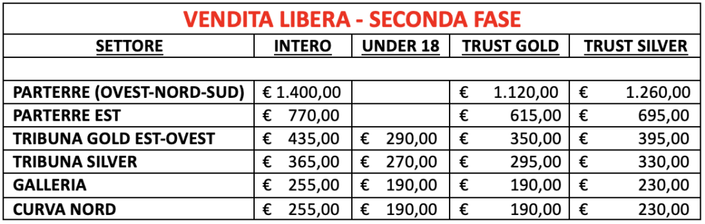 - PRIMA FASE, riservata esclusivamente agli abbonati 23-24, ad esclusione del settore Parterre che, invece, sarà acquistabile da tutti (vedi sotto Promo Parterre).