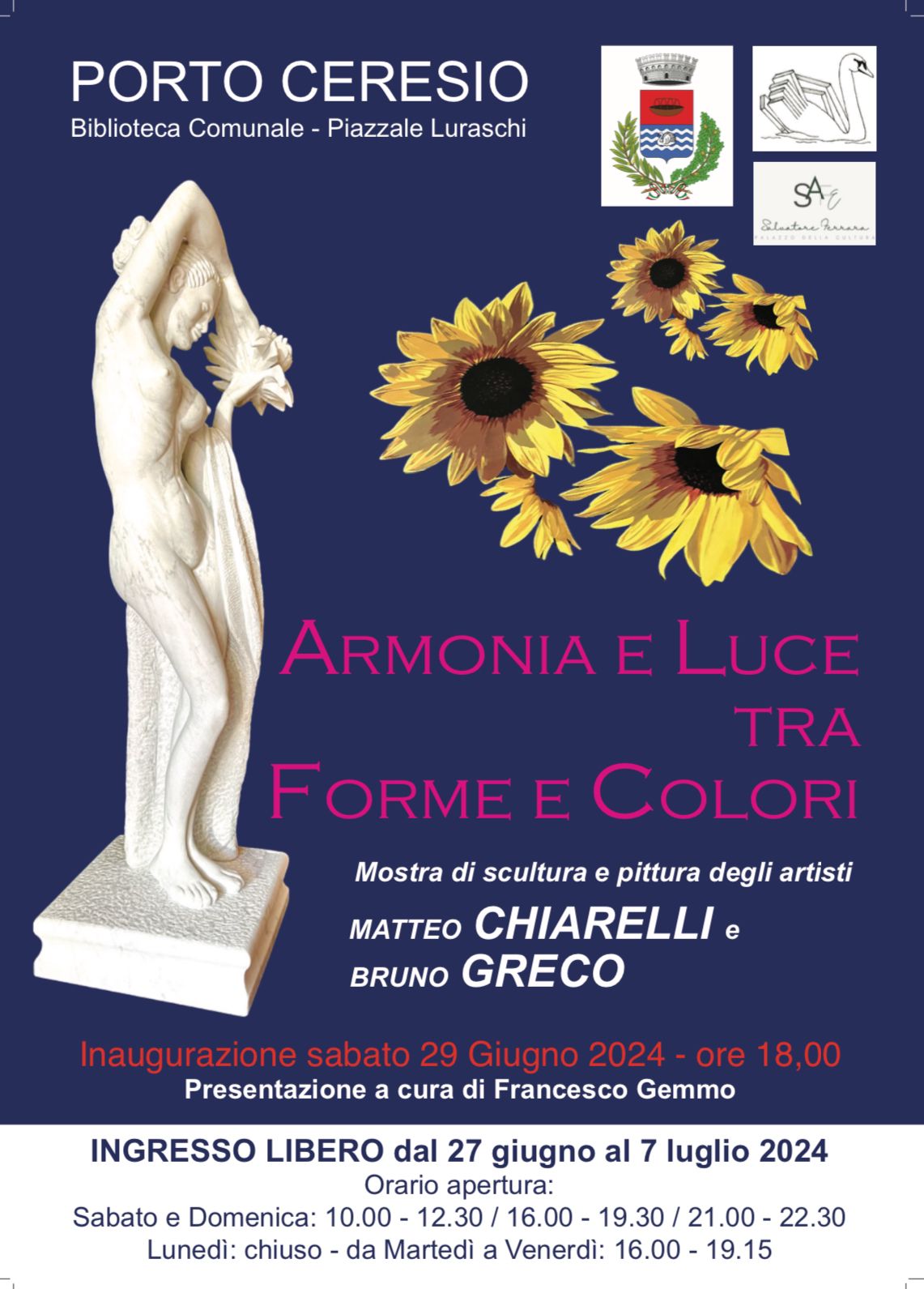 C’è tempo fino al 7 luglio per vedere la mostra degli artisti Bruno Greco e Matteo Chiarelli a cura di Francesco Gemmo. Una mostra che fa parte della 19esima Stagione d’Arte Ceresina organizzata dal Comune di Porto Ceresio da ammirare nell’ampia sala della biblioteca di Porto Ceresio.