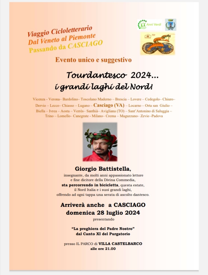 Il 28 luglio il Tour Dantesco farà sosta a Casciago. L’associazione Anni Verdi e l’Amministrazione Comunale sono orgogliose di ospitare questo evento ciclo-culturale presso la storica Villa Castelbarco, sede del comune in Largo De Gasperi. Alle ore 21