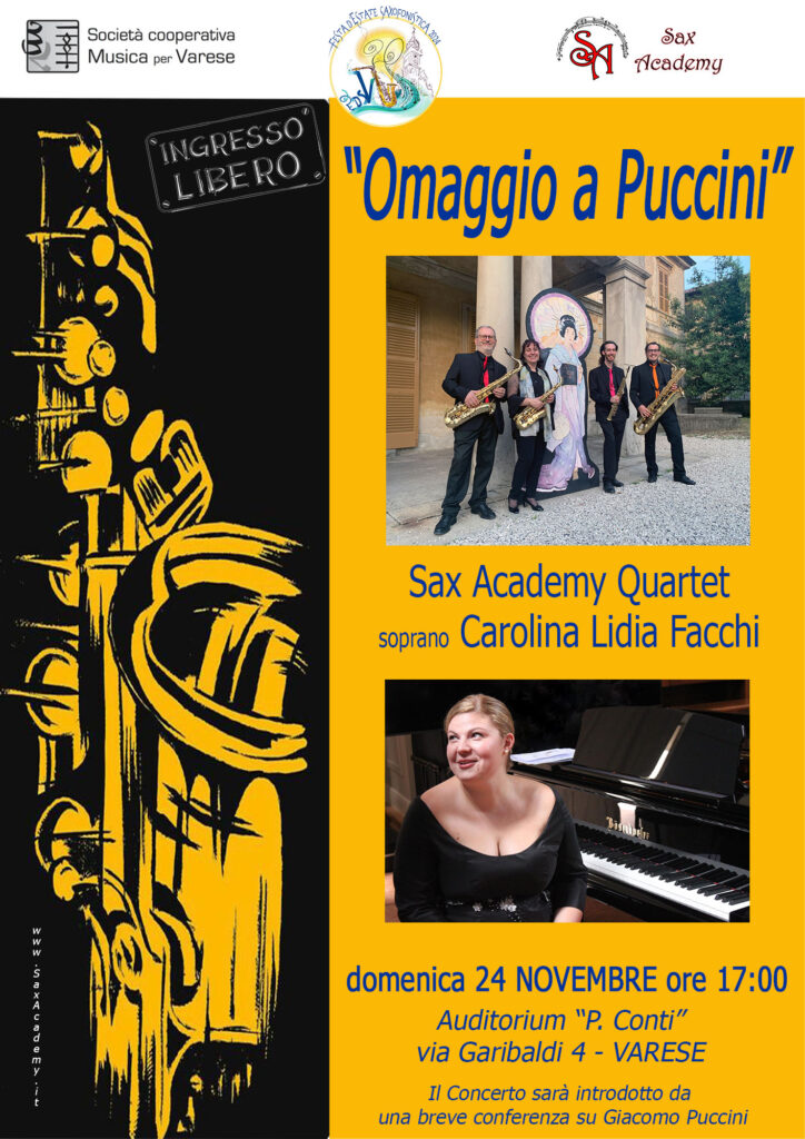 Il 24 novembre 2024 l’Auditorium “P. Conti” di Varese ospiterà alle ore 17 un evento straordinario: il Sax Academy Quartet e la soprano Carolina Lidia Facchi si esibiranno in questa particolare formazione per il concerto “Omaggio a Puccini”.