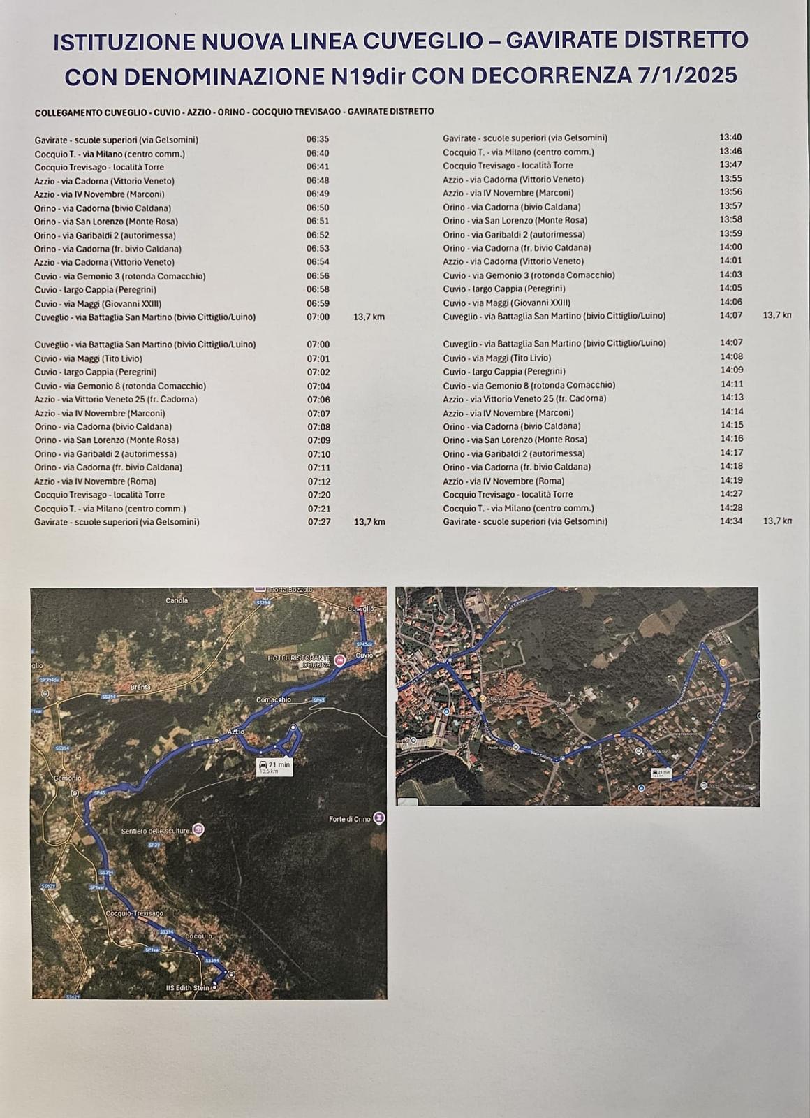 L'autobus partirà alle 7.00 e percorrerà la Provinciale 45 toccando i comuni di Cuvio, Azzio, Orino e Cocquio. Il ritorno partirà dal piazzale della scuola alle 13.40