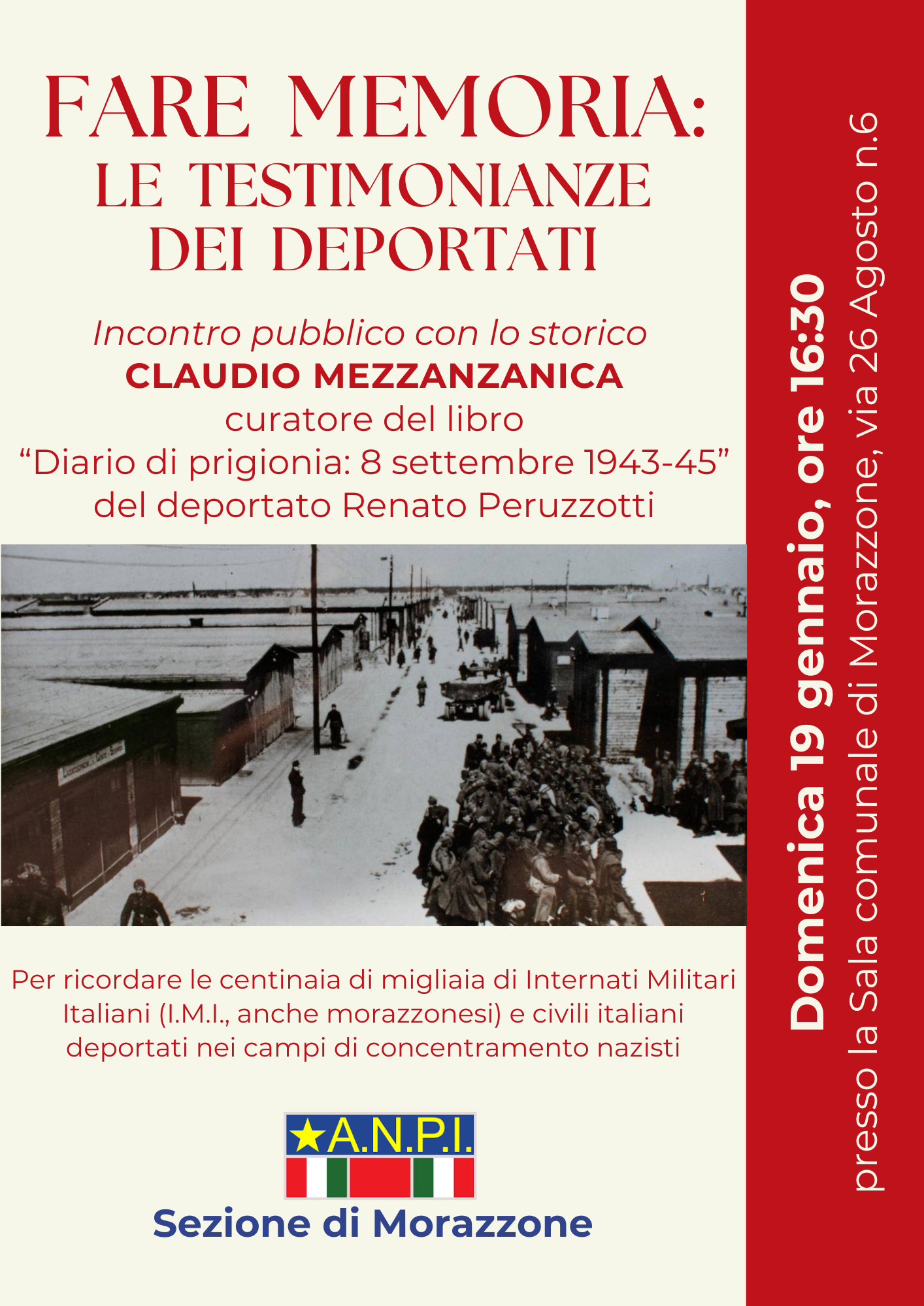 Domenica 19 gennaio alle 16.30 nella sala comunale di via 26 Agosto lo storico Claudio Mezzanzanica condurrà un momento di incontro e confronto dal titolo "Fare memoria: le testimonianze dei deportati", organizzato dalla sezione ANPI di Morazzone