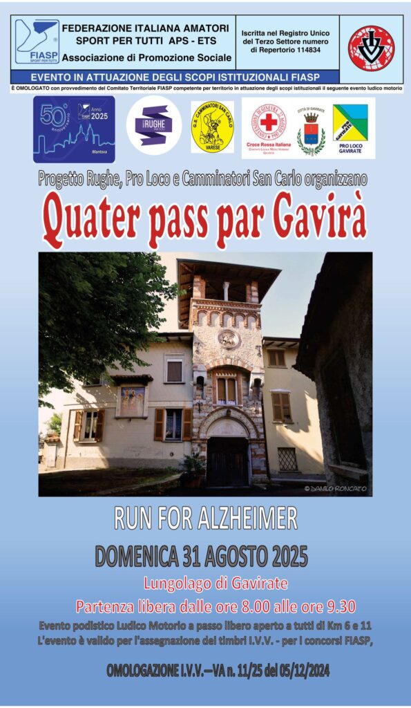 Domenica 31 agosto 2025 Gavirate ospita la nuova edizione di Quater pass par Gavirà – Run for Alzheimer, una camminata ludico-motoria organizzata da Progetto Rughe, Pro Loco Gavirate e GS Camminatori San Carlo. L’iniziativa si svolge sul suggestivo lungolago e unisce sport, socialità e sostegno a progetti dedicati alle persone affette da Alzheimer.