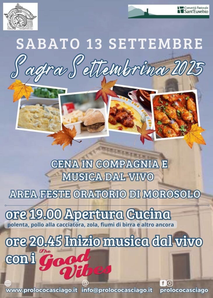 Una serata all’insegna del gusto e del divertimento attende gli abitanti di Casciago e dintorni: sabato 13 settembre 2025 torna la Sagra Settembrina, appuntamento ormai tradizionale promosso dalla Comunità Pastorale Sant’Eusebio e realizzata grazie all’impegno della Pro Loco di Casciago. L’evento si svolge presso l’area feste dell’oratorio di Morosolo, con inizio alle ore 19.00.