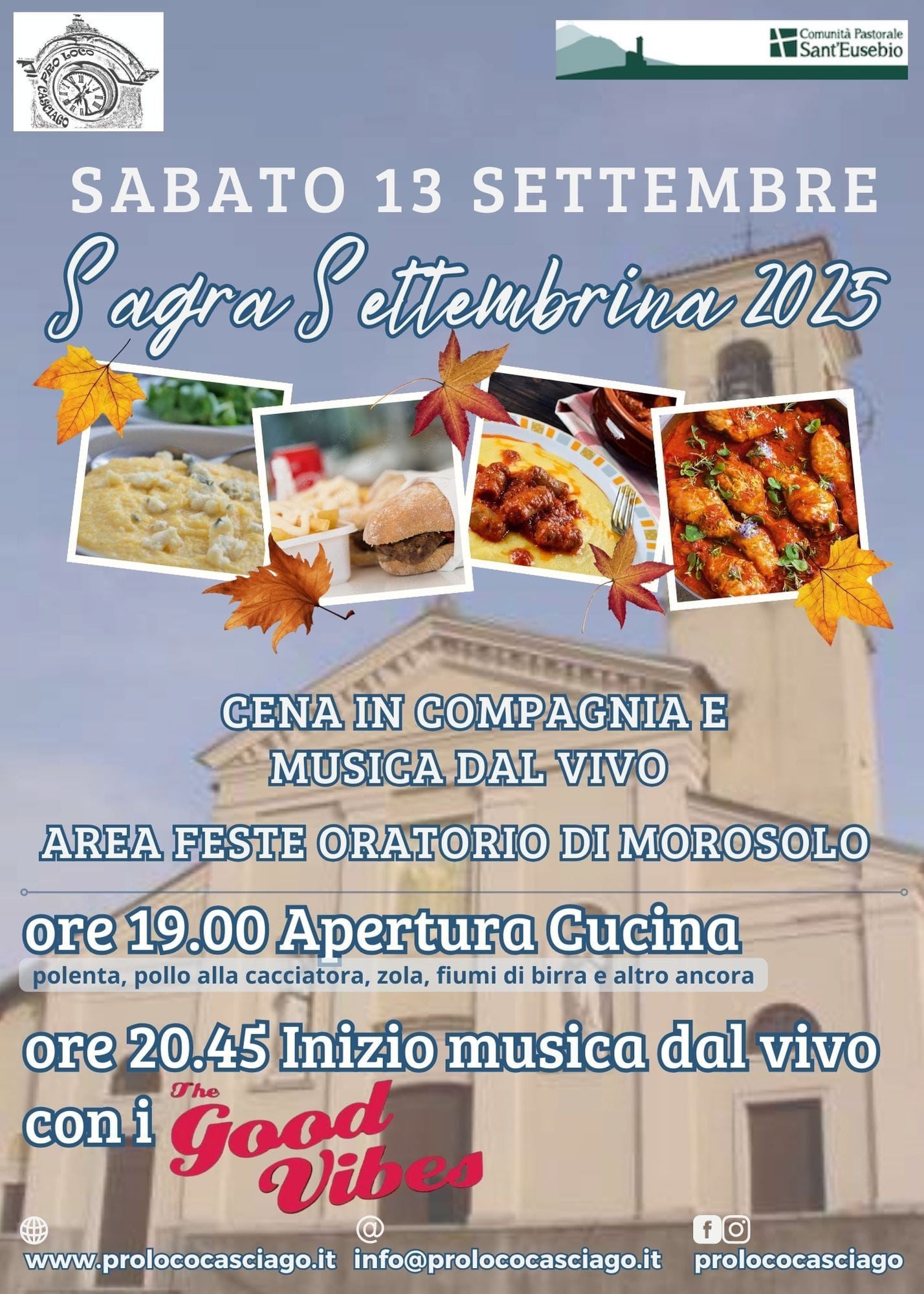 Sabato 13 settembre a Morosolo si celebra la fine dell’estate con piatti tipici e musica live: torna la Sagra Settembrina promossa dalla Comunità Pastorale Sant’Eusebio con la collaborazione della Pro Loco di Casciago