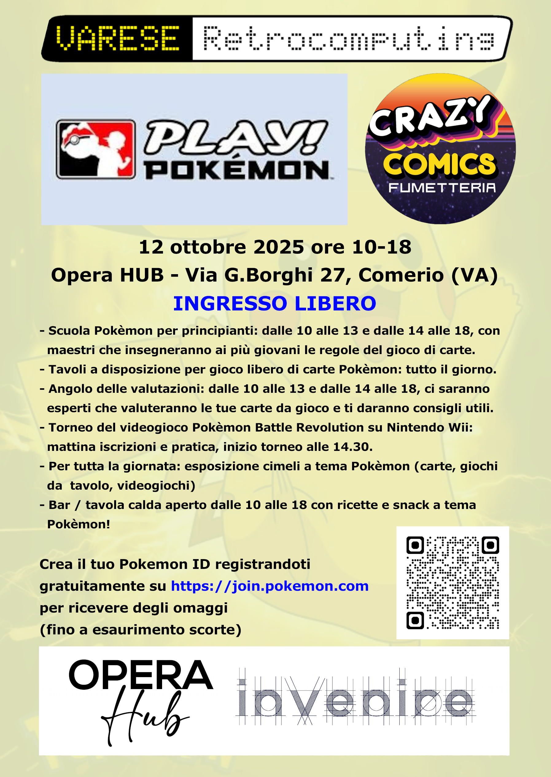 Una giornata per immergersi nel mondo Pokémon, tra carte da gioco, videogiochi e cimeli da collezione. Succede a Comerio, dove domenica 12 ottobre 2025, dalle ore 10 alle 18, Opera HUB (via Giuseppe Borghi 27) ospita una speciale edizione tematica di Varese Retrocomputing, in collaborazione con Crazy Comics e Fumetteria.