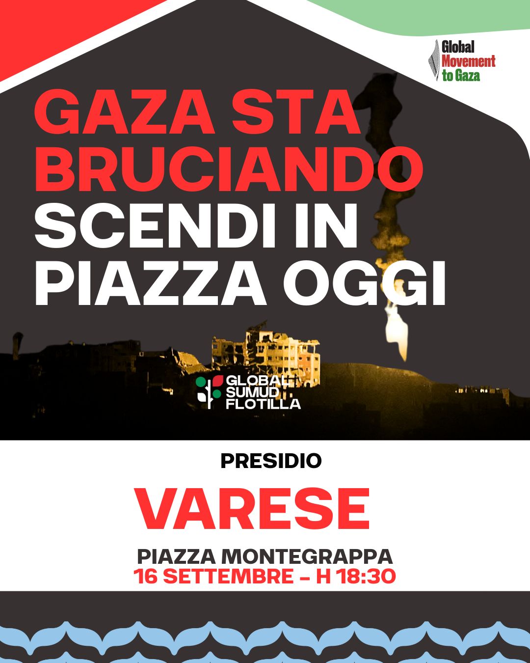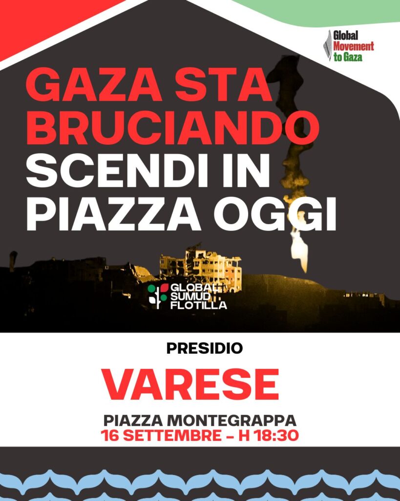 Oggi, 16 settembre 2025, la città di Varese ospita un presidio di solidarietà per Gaza. L’evento, organizzato dal movimento Global Movement to Gaza, avrà luogo in piazza Monte Grappa alle ore 18:30. L’iniziativa, dal titolo significativo “Gaza sta bruciando, scendi in piazza oggi“, invita la cittadinanza a partecipare a un momento di riflessione e di denuncia della tragica situazione che coinvolge la Striscia di Gaza.