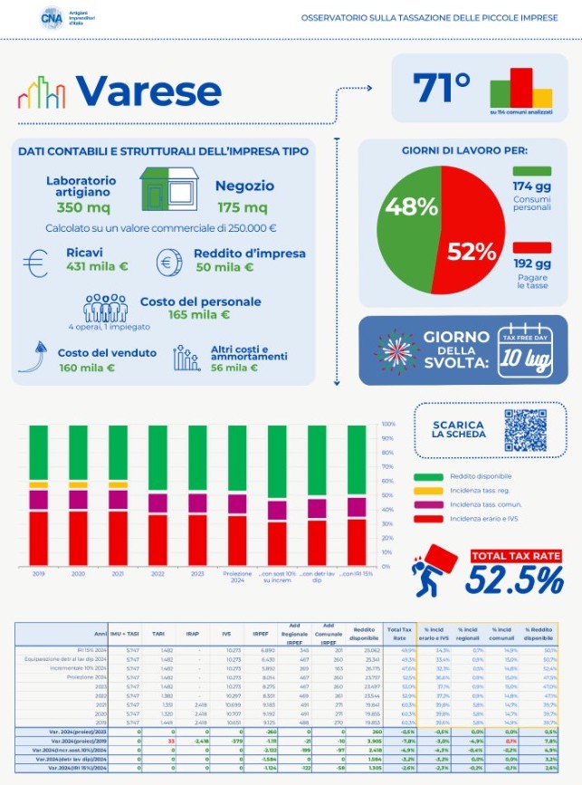 Nel 2024 il total tax rate scende al 52,3%. Le imprese personali lavorano due giorni in meno per il fisco. Varese avanza di una posizione nella classifica nazionale e segna un miglioramento minimo: gli imprenditori iniziano a lavorare per sé il 10 luglio